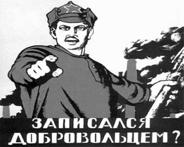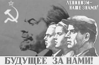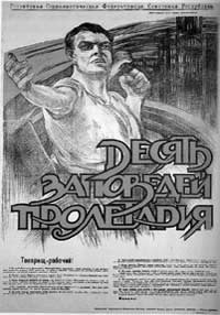Sovet İttifaqının liderliyində təşkil edilən Üçüncü Kommunist Beynəlxalq təbliğat plakatı. Bayrağı daşıyan xadimin üzündə kommunizmin soyuq dünyasının tam təsviri görünür. |